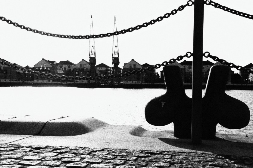 The docks are now a hub for a variety of conferencing, entertainment and leisure industries, although as it’s the middle of winter, all of the water borne leisure facilities are closed. There are few people milling around although there is a steady stream of visitors making their way into the Sunborn Yacht Hotel which is permanently moored by the ExCel Centre. This shot is taken through the legs of one of the cranes on the opposite side of the dock.