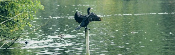 12/09/2018 – The lake in Kelsey Park boasts having at least two cormorants, one proudly displaying its wings high up in its tree perch, and another doing likewise perched on a post mid lake; a good opportunity to test my camera handling skills at full zoom. I rest against railings on a wall to steady myself whilst standing under a large tree sheltering from the downpour of rain.