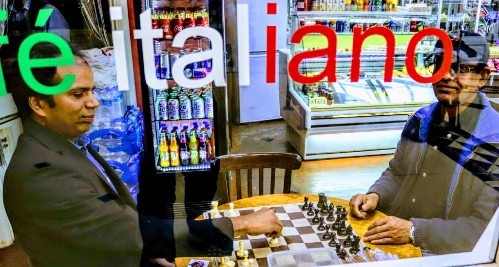 The Caffe is inside the Vicarage Fields centre where I see a couple of gents playing chess through the window. I go inside where there’s a small gathering enjoying the sepctacle, and for the price of playing a game, I’m allowed to take their picture. I diplomatically lost the game.