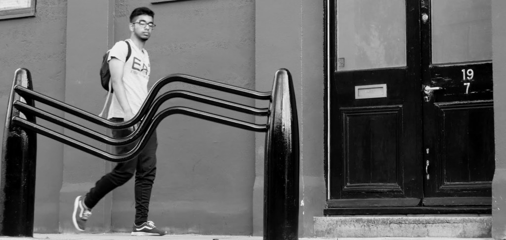 Three Colts Lane is along the arches that runs under the mainline track from Bethnal Green into Liverpool Street station. I’d spent a little while exploring the area and the zigzaggy street furniture caught my eye as it complemented the door, balanced with the grey walls. I saw this young gent approaching the shot and I wanted to capture him as he walked through, and hence the slight blur.