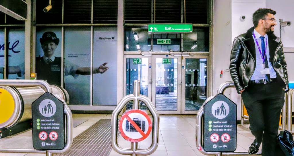 Heathrow is designed to move people about as quickly as possible and to help with passenger flow clear signage is essential. The airport does this well. This shot at the top of a flight of escalators emerging into the airport amused me as I felt the window poster of the policewoman was quite welcoming despite the staff member’s indifference on the other side.