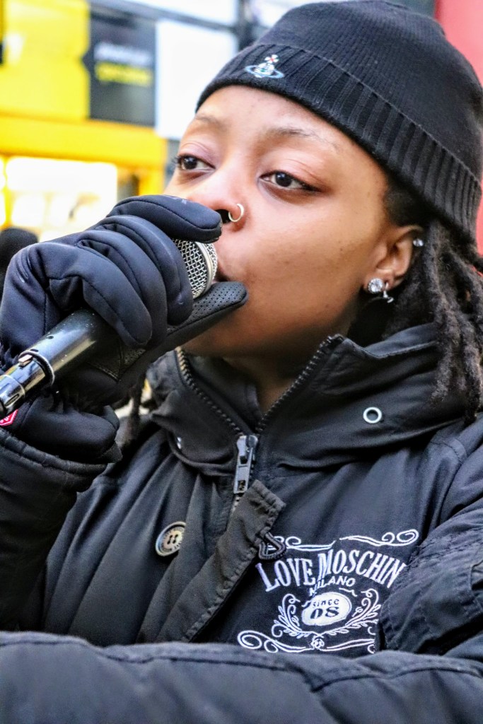 A talented musician with a very acute ear and a sharp mind as her rap takes in things in her immediate surrounds; including my distraction. She stops for a short while and she’s happy to chat, eager to understand where are the best spots for busking in the East End. I’m no expert but I offer some suggestions.
