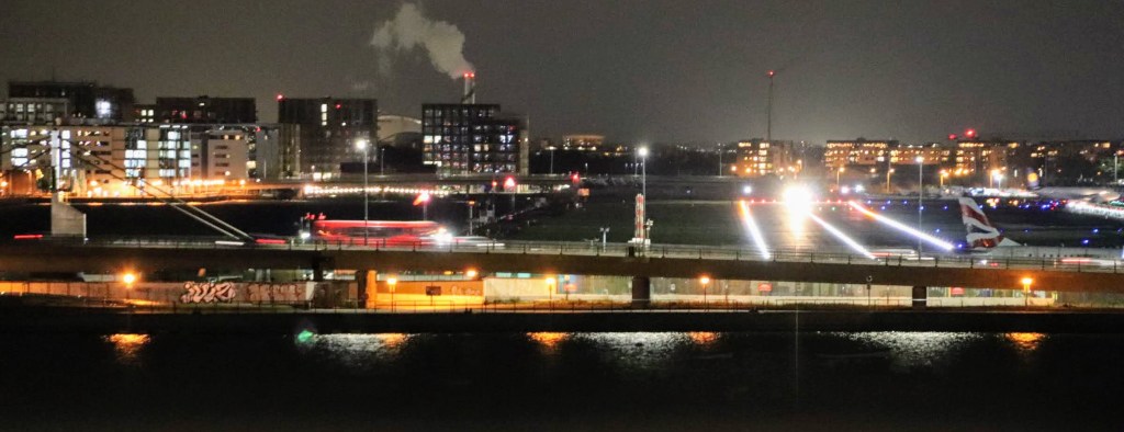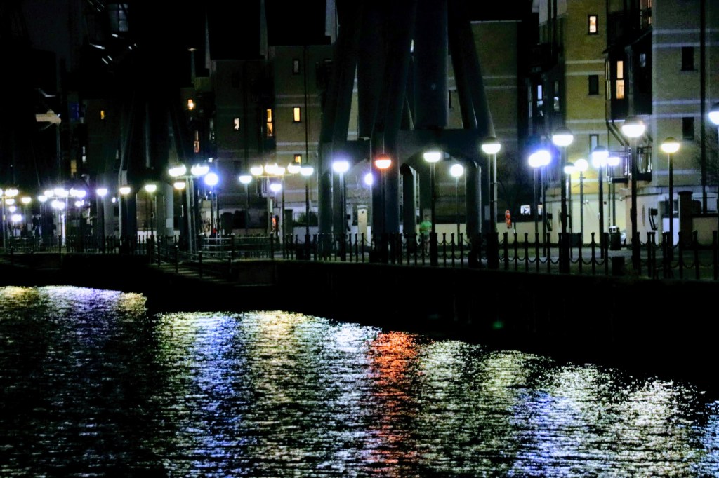 The low lit footpath on the southern end of the docks cast colourful shapes on the water’s surface transforming an otherwise drab vista into an almost Mediterranean one – oh if it were only warmer.