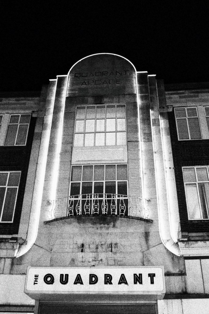 This night time setting, with the entrance’s design highlighted with neon blue lighting, casts a lonely, and somewhat eerie figure on the quiet South Street after the shops have closed.