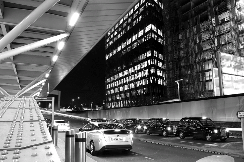 The trailing light effect and the static taxis in the foreground help to portray life for the black cab driver at night time. And if you look up at the nearby office block, you might think it’s party central on the 5th floor as the floor lights switch on and off.