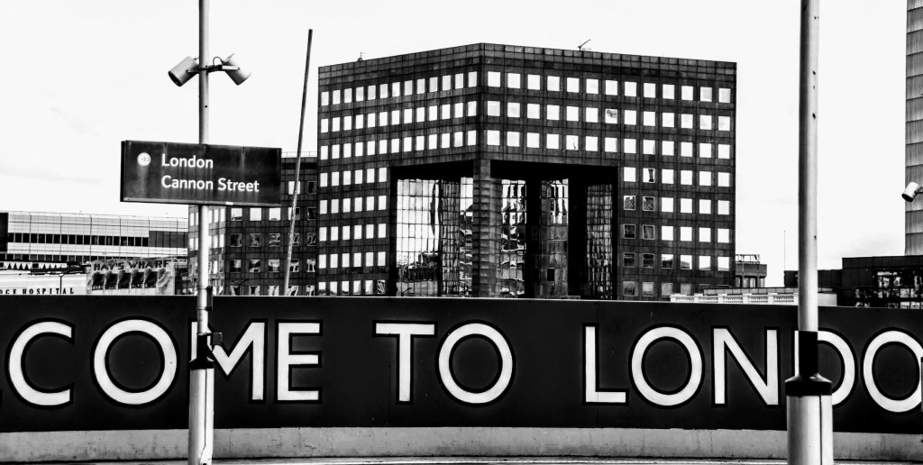 No. 1 London Bridge – this view is taken from the station platform, and although I’ve presented it here in black and white, the building is instantly recognisable for two things. First, its pink granite exterior and secondly, its corner cut out. However, I have intentionally framed this shot to capture the station signage welcoming you to London – albeit abridged here to invite you to COME TO LONDON.