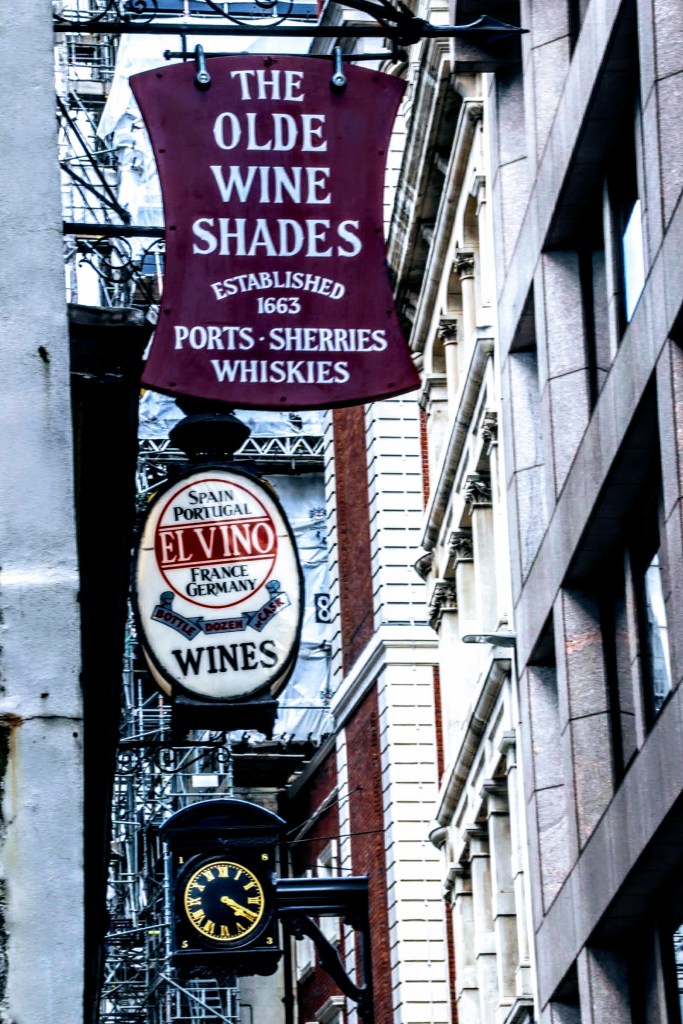 Martin Lane – the lane runs down from Monument to Lower Thames Street, and this upward shot capturing pub signs and a clock with a scaffolding backdrop indicates London’s building diversity. The pub building was originally a merchant’s house with smuggling connections with reports of a tunnel down to the river’s edge, but of course, no longer there. So instead, the pub promotes itself as being ‘…the oldest in the City, one of only a few buildings in the area which survived The Great Fire of London. With its smuggling trade history, it is where charm and character collide with a Spanish, Portuguese and South American flavour…’