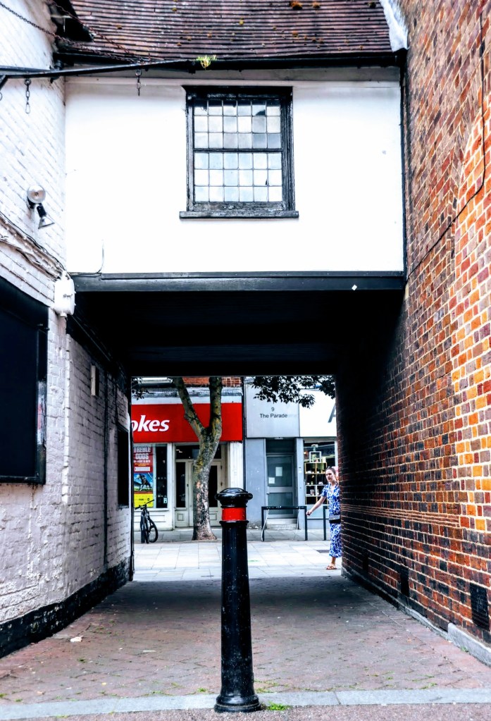 Further down High Street, there’s an unnamed alley through to Wellstones. Pretty indistinct, but used by shoppers to access the car park, judging by the number of people using it laden with full shopping bags. I was hopeful to capture this alleyway without any pedestrians passing through as it has a curious mix of old-world architecture and new.
