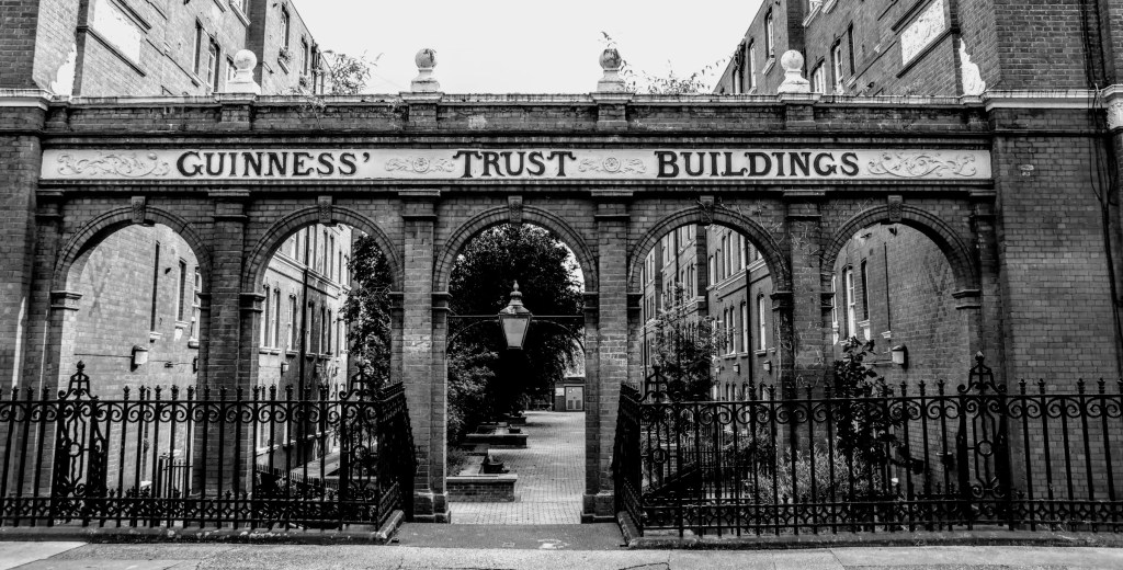 Further along, and in the shadow of the Shard, stands a dramatic housing estate, one of the original built by the Guinness Trust. The image here shows its architectural heritage that symbolises the Trusts’ history.