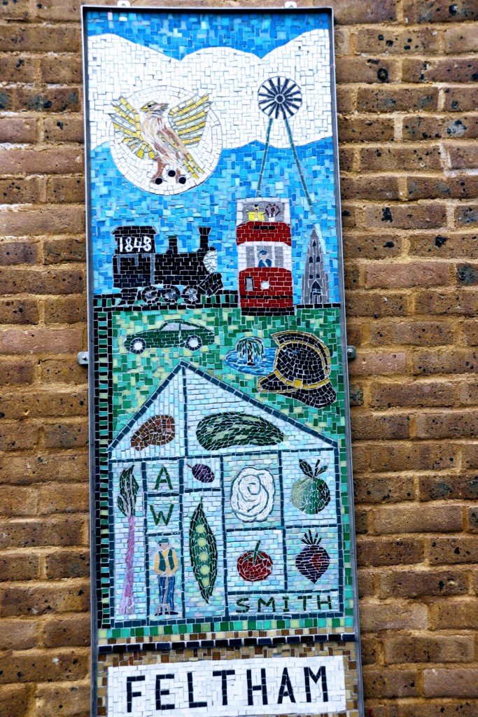 The area was home to two air-raid shelters demolished during recent bridge modernisation works and commemorated now by several mosaics embedded in the wall along the Pond’s western edge. There are other mosaics, too, representing the convergence of Hanworth, Feltham and Bedfont districts at this point.