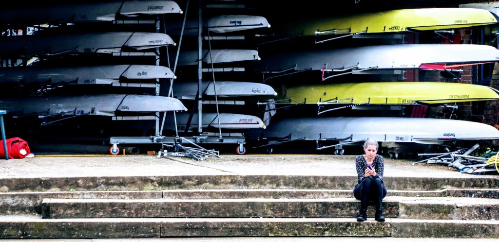 Twickenham Rowing Club is directly opposite me. Some solitary rowers are on the river showing off their cardio-vascular strength and hand-eye coordination capabilities as they glide gracefully up and down this stretch of the river. I also spot this girl taking a moment of solace, or maybe she’s waiting for others to join her. Regardless, it’s an impressive collection of rowing boats, with as many again out of shot in the open air.