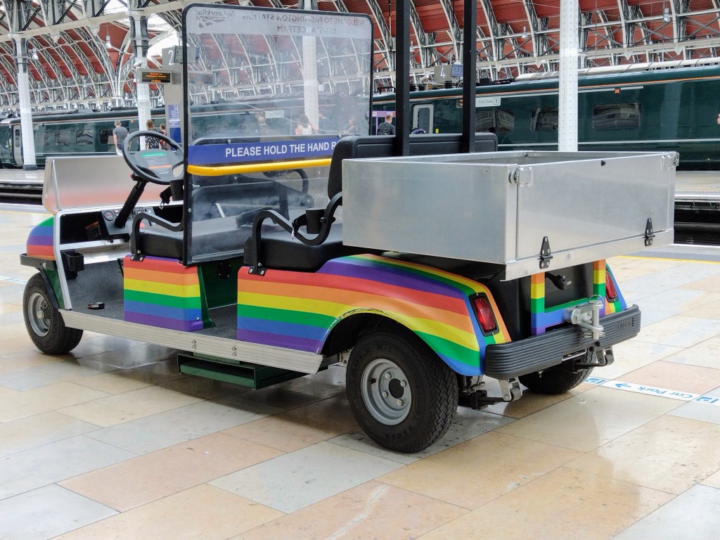 Getting around – from the station’s main concourse to the ends of the platforms is over 200 metres long. The station provides an assistance service for those less able passengers via an electrified cart capable of carrying three passengers and their luggage. And it’s nice to see that the station takes ‘Pride’ in how it has bedecked their cart.