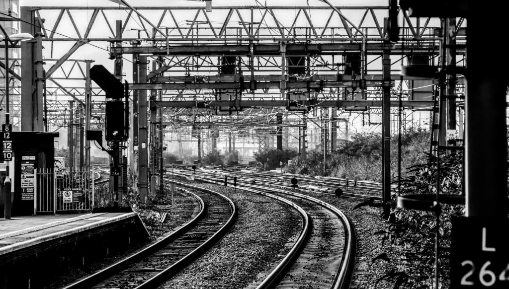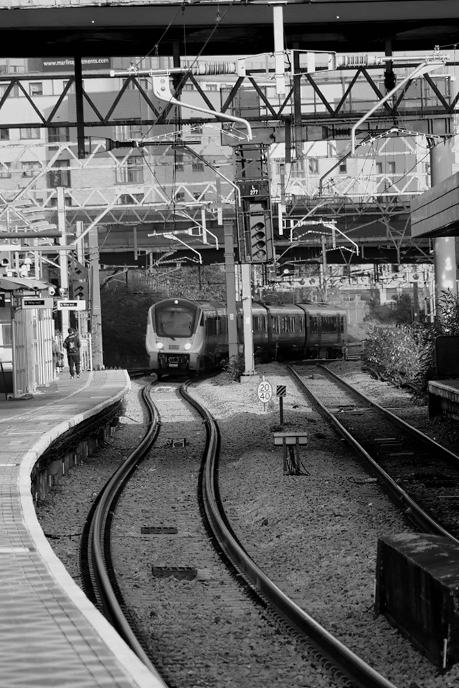 I’ve cropped the image so that the overhead footbridge appears to join the two stairwells together. I’ve also enhanced the black and white effect to create a somewhat industrial ruggedness. The solitary passenger making their way along an otherwise empty platform evokes a feeling of emptiness.