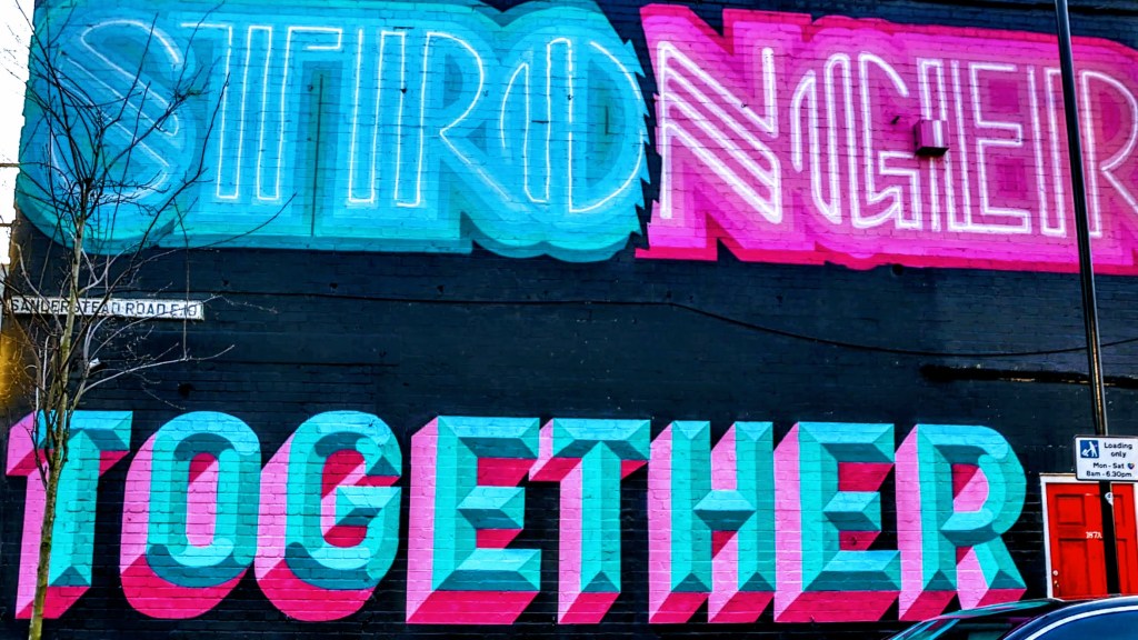 Stronger Together – On the corner of Sanderstead Road and Lea Bridge Road, this brightly coloured neon mural jumps at you. What does it mean: Labour’s strapline or the anti-slavery tag? Maybe something else, but stand back and admire the artistry.