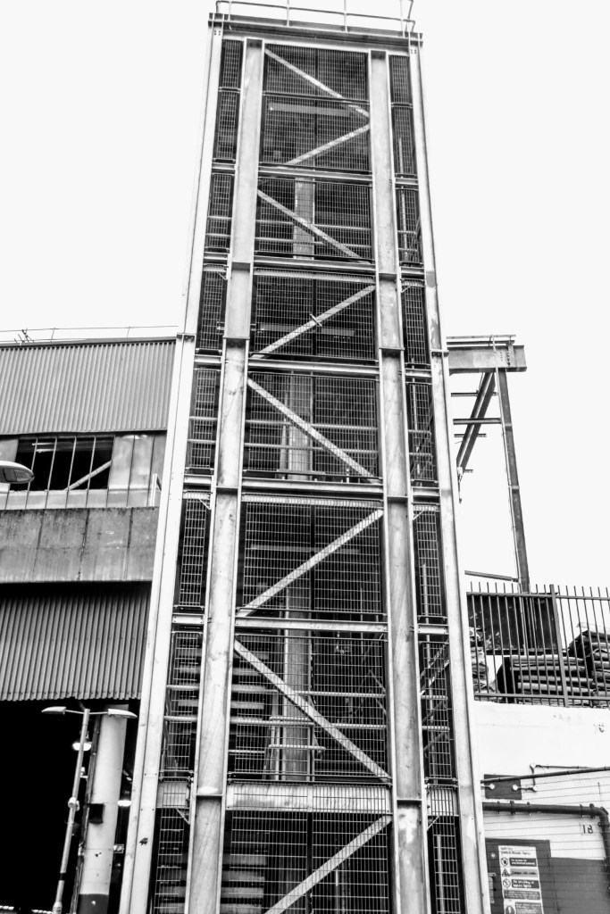 Further research reveals the building is now a Royal Mail distribution centre. But I couldn’t determine whether this caged, locked, and inaccessible stairway is emergency access for the distribution centre.