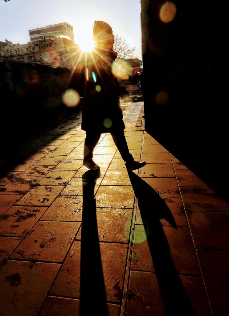 I’m delighted with the outcome with the pedestrian just off centre shot haloed by the sun and the contrasting deep dark black shadows and sharp highlighted lighter tones. I think the photo speaks for itself.