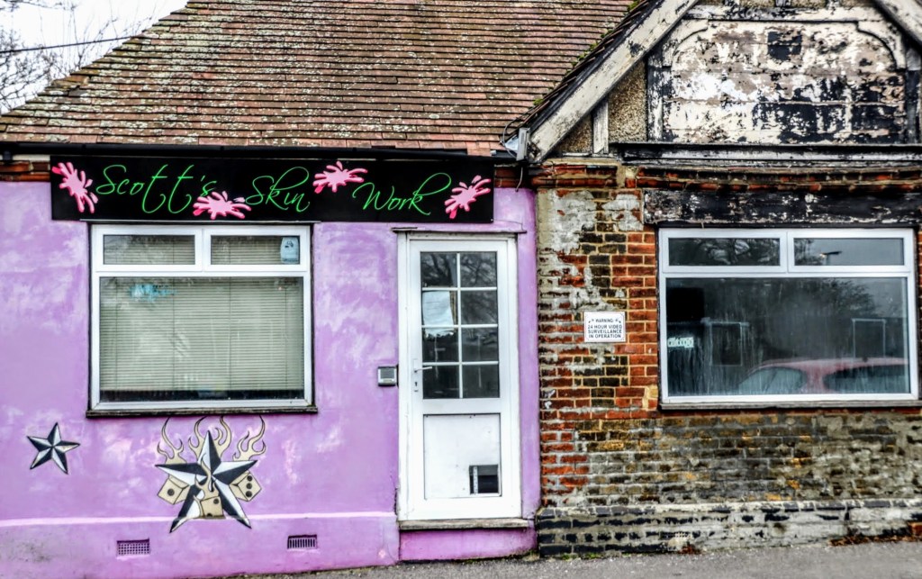 There are empty shops and unloved buildings nearby which add to the sense of economic hardship. But, alas, Scott’s Skin Works is no more as the building has been repossessed, according to the sign on the door. It’s unclear whether this is the effect of Covid lockdown or another cause.