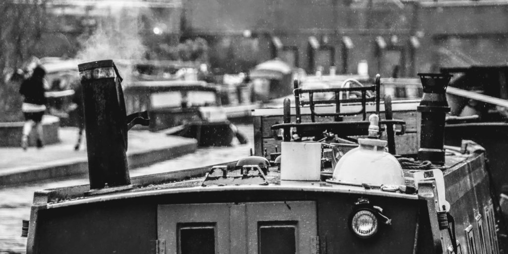 But it’s a drizzly day on Regent’s Canal, and it seems the occupant of this barge has set up their stove to keep warm (or make a brew), evidenced by the smoke drifting out of the chimney as runners on the opposite towpath pass by.