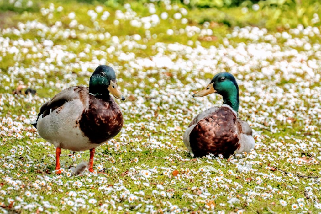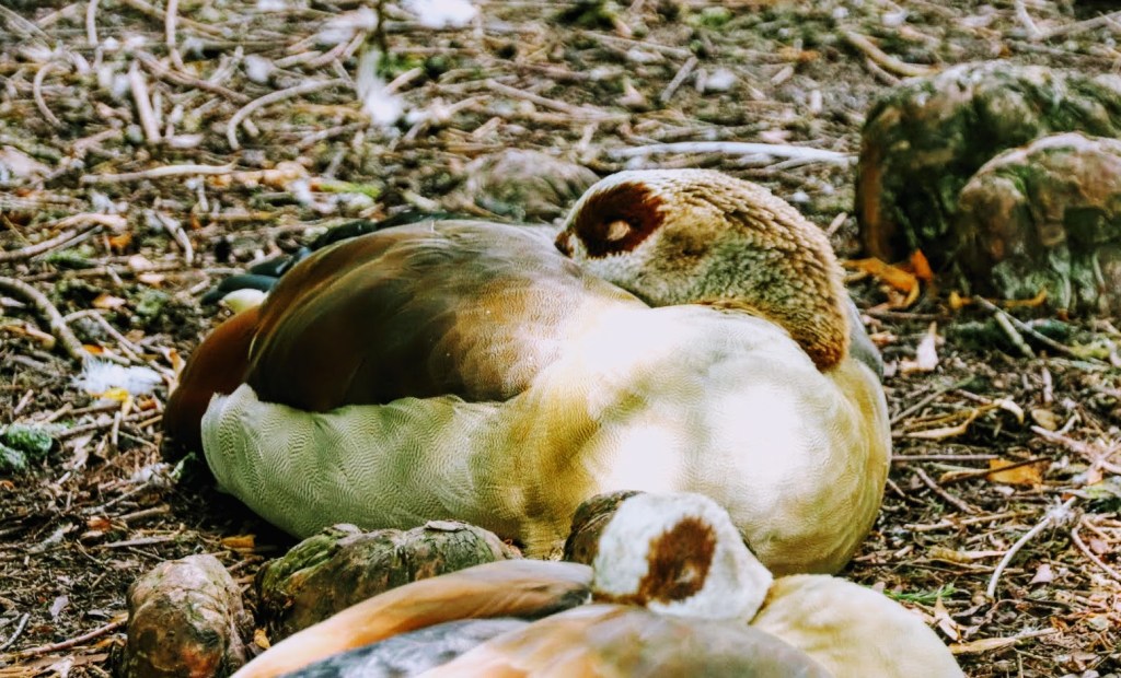 Egyptian Geese are the dominant species. Some take respite under the leafy shade from the pond-side trees, and others strut their stuff in the open parkland next to the children’s playground. Other species include Mallards, and one Coot family caught my attention as mum ferried and fed two very young chicks as they hurried by the pond’s edge.