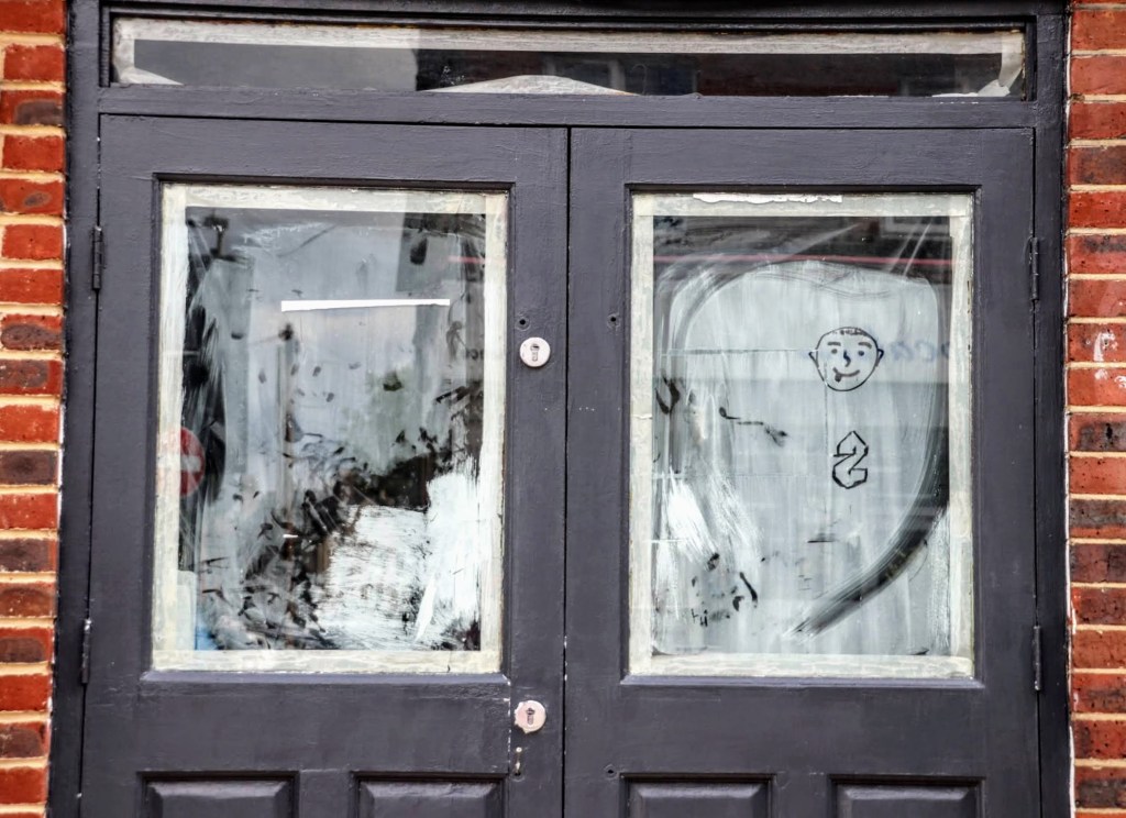 The town has its fair share of closed shops and restaurants, and it seems the former Reku Zen Asian restaurant didn’t survive Covid. Its buffet approach to serving food made it difficult to trade during the lockdown restrictions. Redecorating is now the order of the day, so who knows if life will return to this once popular eatery? The drawing inside the front door’s whitewashed glazing made me smile.