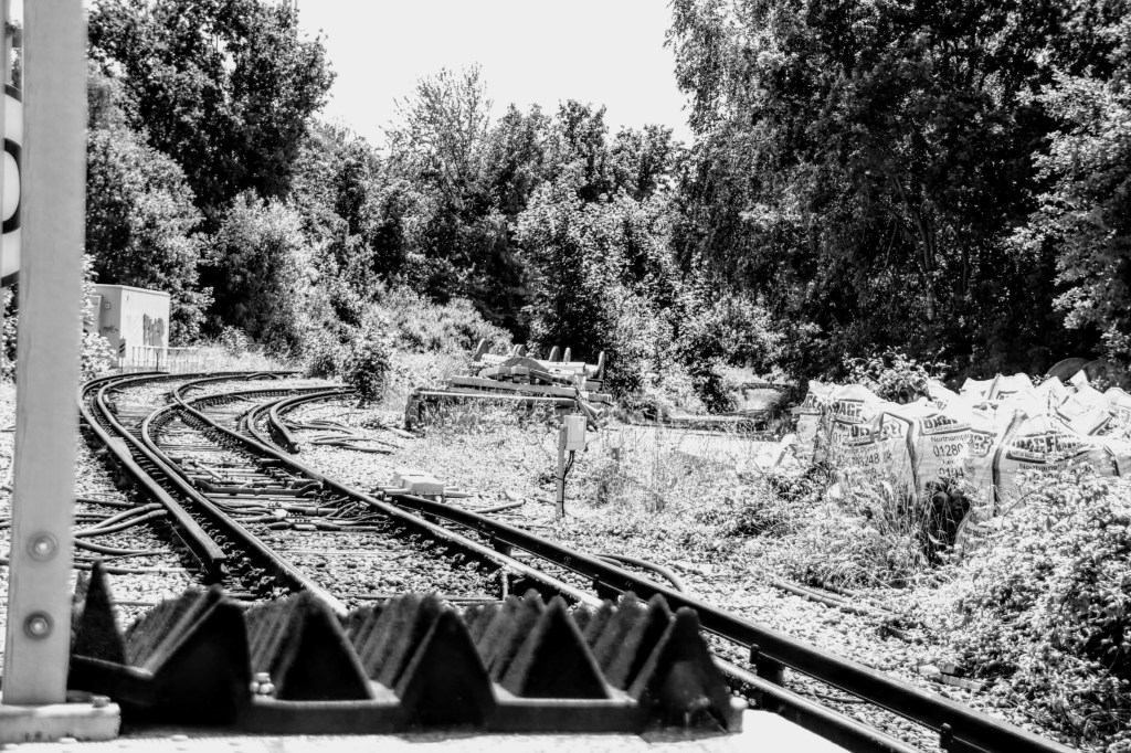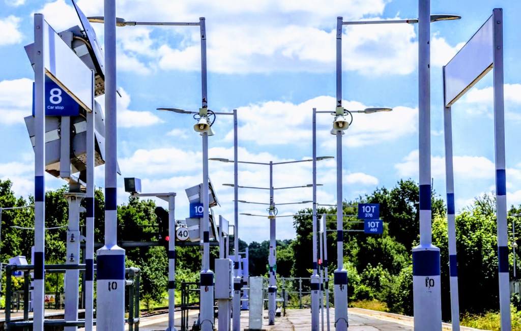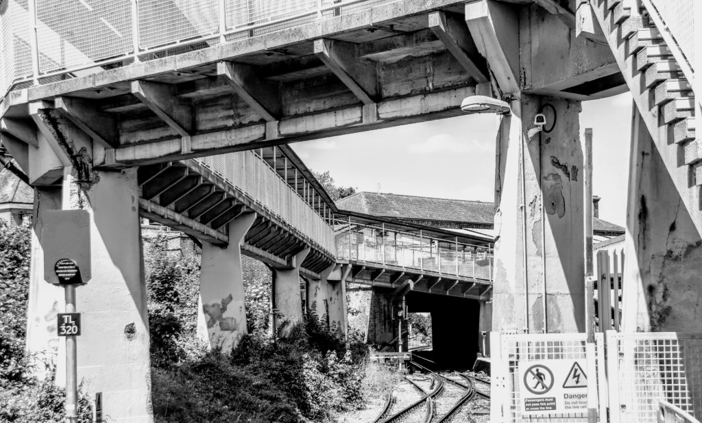 Access to platform one is intricate and sadly not accessible to those with mobility needs; I believe there are plans to change this, but when I don’t know? There’s a flat, high-rise caged walkway from the station ticket hall that dog-legs from the sloping entrance that leads down to platforms 2 and 3. It travels over the rail line that terminates on platform 1, culminating in a steep flight of stairs. There’s also a separate bridge that interconnects with all other platforms further down the platform, but again it’s not step-free.
