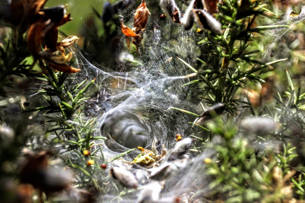 Nature’s beauty is abundant as I look around and enjoy the variety of grasses, wildflowers, and the sound of birds. But the sound I noticed was that of gorse seed pods bursting open, reminding me of popping candy. The gorse is covered in gossamer, and this funnel-shaped web is home to a Labyrinth spider. Isn’t nature genuinely amazing?