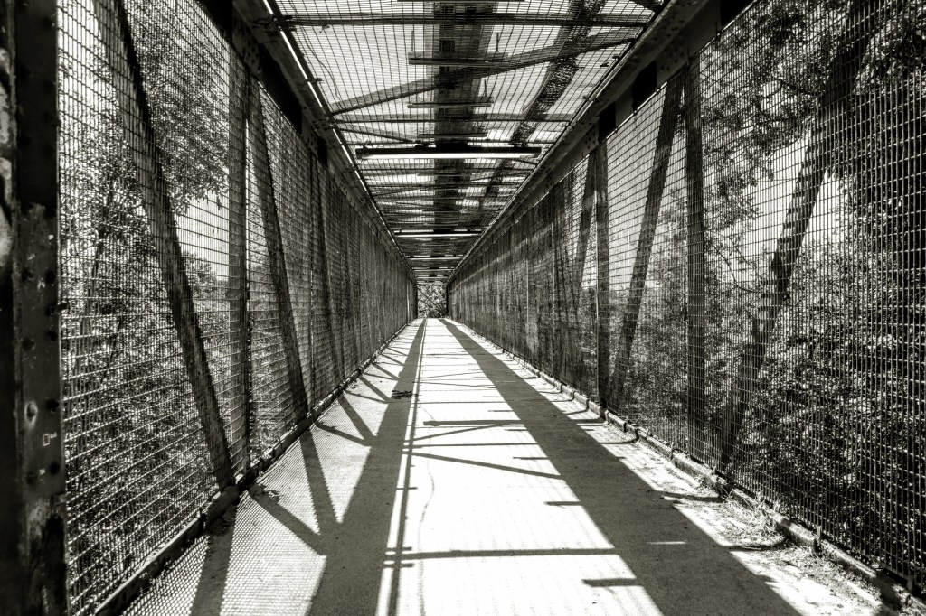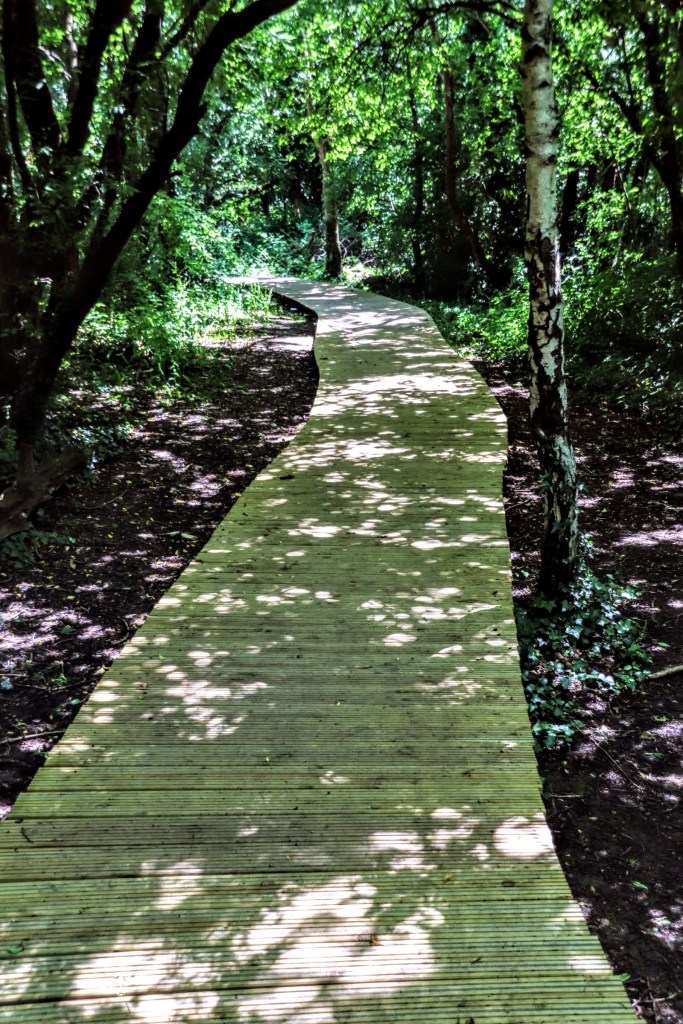 The walk around the reserve is a circular route, and if you continue along the Railway Children’s Walk, you make your way towards Hither Green Cemetery across this footbridge. In the daytime and full sun, the shadows create a stunning image, but it’s not a route I’d contemplate taking alone and at night.
