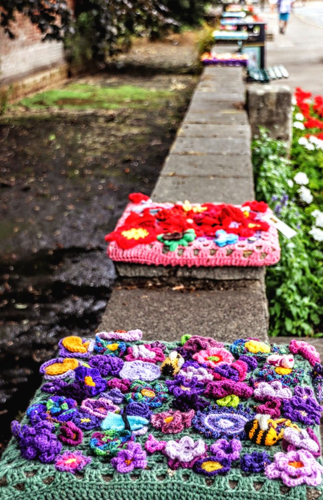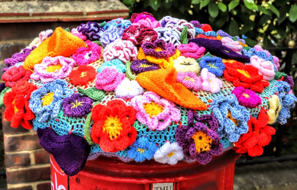 As I walked from the station into Ewell, I encountered one of many knitted or crocheted pieces on the side of the road. They all had a simple sign asking passers-by to support Ewell in Bloom and leave them alone so that others could enjoy the work and that they could be judged. Here are a couple of examples of handicrafts on display from the Yarn Bombers of Ewell – follow them in Facebook