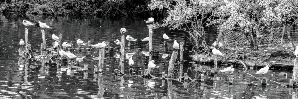 My last memory is of a large pond overlooked by mainly black-headed gulls, which had taken up residence on stilt-like posts in the middle of the pond. But with one bark, they were gone, scared off by the sudden sound. But this helped me notice a family of herons parched further into the pond.