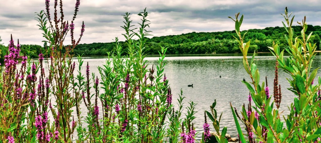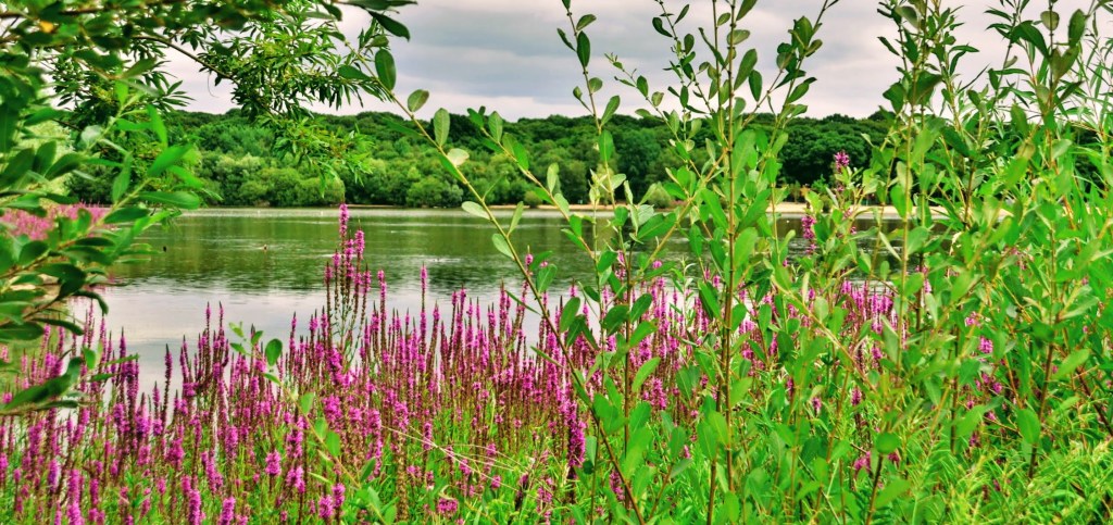 The Lido is a 60-acre lake/reservoir described as somewhere to have the fun of the seaside closer to home. A place for a family day out to enjoy woodland walks, a miniature railway, beach and play areas with climbing frames and much more. As I arrived from Reservoir Road, the view was outstanding. The shoreline, albeit a bit low, was smothered with pink flowers amongst the greenery of the surrounding foliage.