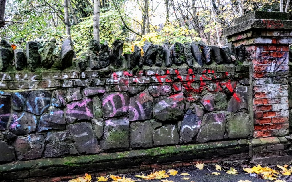 The Shirebourne emerges north of Barnet in the King George’s Fields in Hadley. If you follow it on Google maps, it disappears where Bosworth Road meets Burnside Close. But if you follow a line to the Victoria Recreation Grounds in New Barnet, it reemerges from its culvert under a bridge. Sadly, the bridge has been unimaginatively decorated by local graffiti artists.