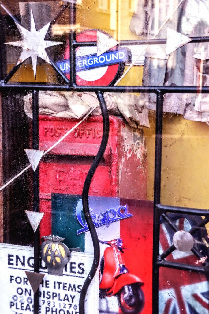 The window displays have a plethora of unrelated items. From furniture, a ceramic bird and even an old post box. Eclectic or what? Yet, this latter-day recycling shop hasn’t entirely outlived its usefulness, as it has provided me with this opportunity to capture it.