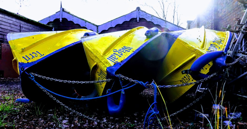 I saw these three boats on their side behind the Boathouse and thought their colours were attractive in the mid-winter gloom. So as I crouched down to get the best angle, I was confronted by one man and his dog. It turns out he is the Boathouse owner, and after an initial explanation of what I was doing, he was bemused by my interest in his boats. These are the hourly hire boats named Tern, Wagtail and Little Grebe.