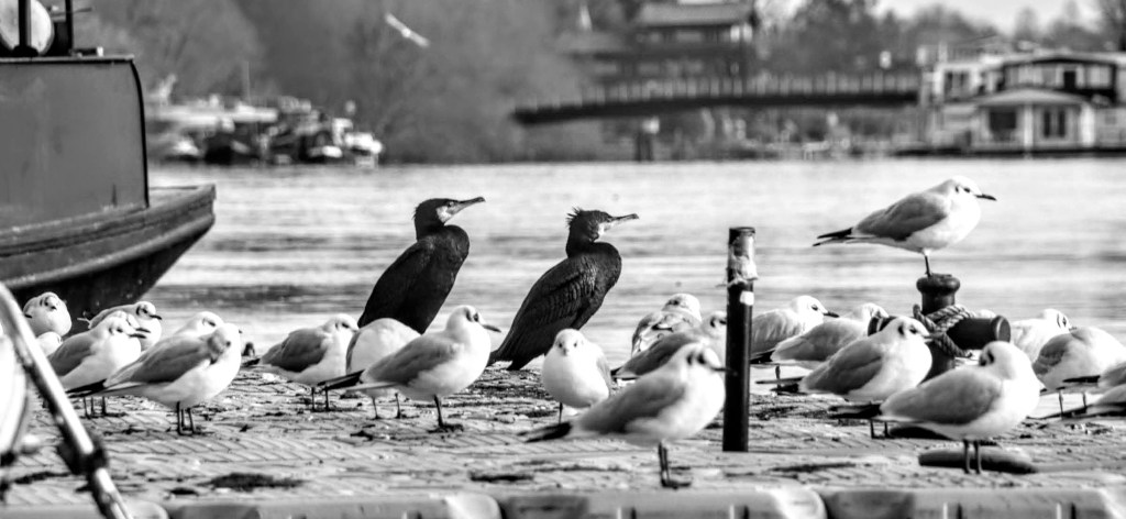 Head south, and you’ll soon find the river, which is almost overflowing. You’ll find Bell Hill Recreation Ground quite easily, with wonderful views up and down the river. There’s quite a lot going on, even in the dead of winter. Not obvious, but take a moment to enjoy the relative peace, and you’ll see water birds busying themselves. And as the hazy sunlight peeks through the wintry haze, I can capture the reflections and dark shadows from the riverbanks.