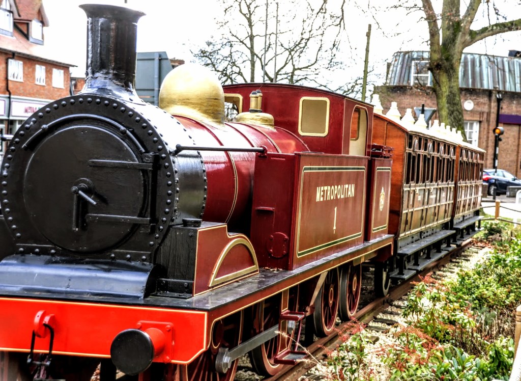 But don’t let that deter your visit. As you reach the top of the hill at the junction with Chesham and Sycamore Roads, you’ll see a magnificent half-size miniature replica of Metropolitan No.1 train. This train was, in real life, the steam locomotive that hauled the last passenger steam service on the London Underground in 1961. It’s now preserved at the nearby Buckinghamshire Railway Centre, and I’m grateful to IanVisits, who wrote about the model when it first appeared in 2021, for bringing this to my attention.