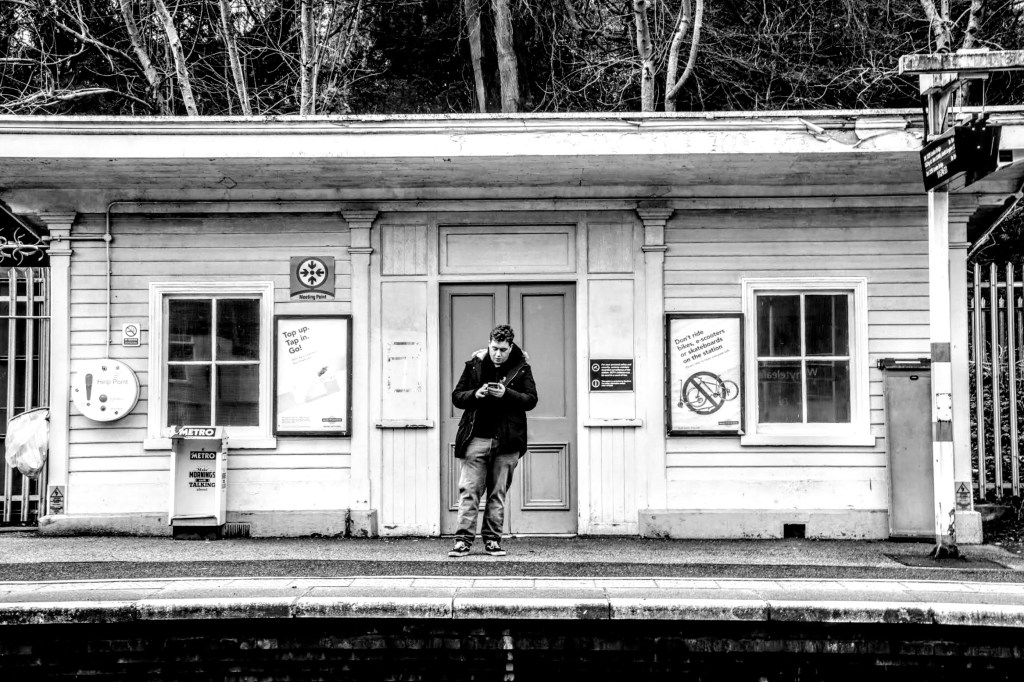 For completeness, here are a couple of images of the two stations. The first shows off Southern Rail’s reflected green livery at Whyteleafe. And the second is of a waiting passenger at Whyteleafe South. He saw me taking photos, but he was so engrossed in studying his mobile that he seemed not to care that I was lining him up for this shot.