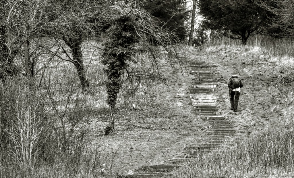 From the grounds, I was undecided about which way to head next, and my dog companion suggested a hike up the Devil’s Steps and over the top, where I could head towards Kenley rail station. I don’t know if the Devil’s Steps is an official or a local name, but I can understand why they are so named. I saw this intrepid rambler walking alongside the steps and wondered why until I started climbing them myself. The steep and rugged steps break your stride pattern walking up, so I now understand that walking to one side made the ascent more bearable. Even so, a stop halfway was needed.